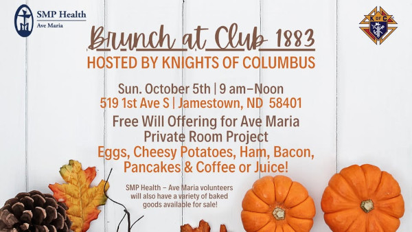 Jamestown (SMP Health) – The Knights of Columbus invite the community to enjoy a hearty brunch on Sunday, October 5 at Club 1883, 519 1st Ave S in Jamestown. The event runs from 9 a.m. to noon and will feature a free-will offering to support the Ave Maria Private Room Project.