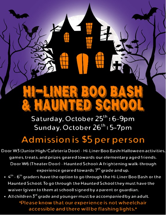 The Hi-Liner Boo Bash is designed for elementary-aged children and will include games, activities, treats, and prizes. Families attending the Boo Bash should use door W3, located at the junior high and cafeteria entrance.
