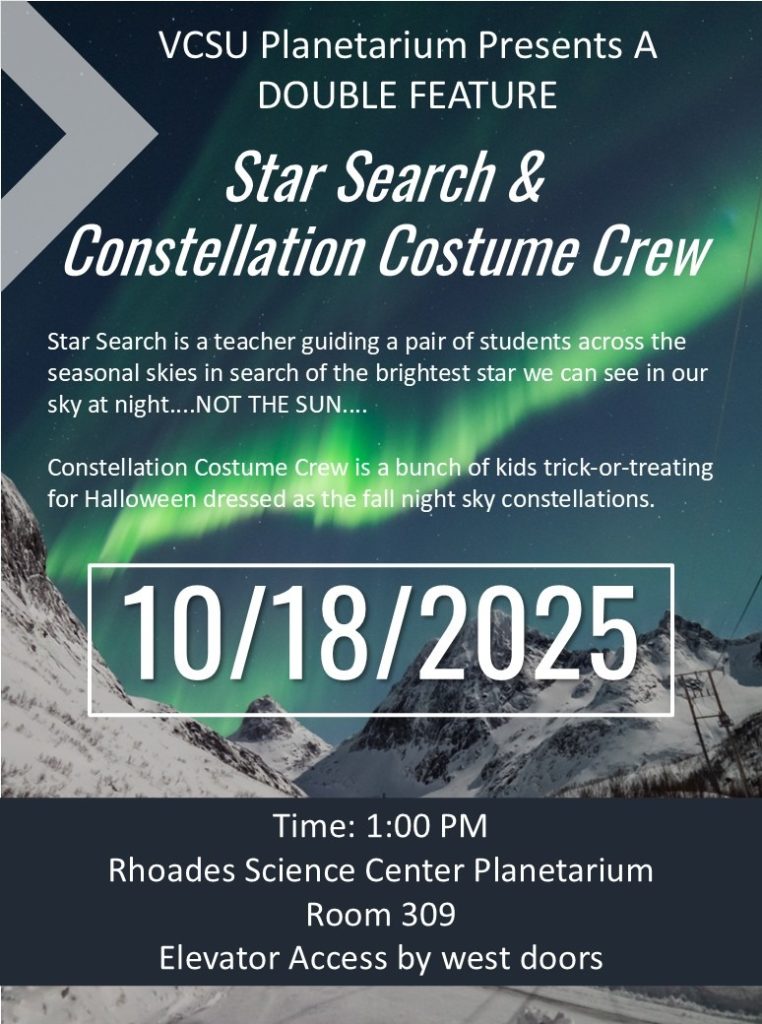 Valley City – You are invited to enjoy 2 free planetarium shows Sat Oct 18, in Room 309 of the Rhoades Science Center. (An elevator is available at the west entrance.)