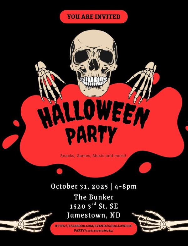 The Halloween Party at The Bunker takes place from 4:00 to 8:00 p.m., offering a fun and festive atmosphere to celebrate the evening. Trick-or-treaters can also stop at the Jamestown Rural Fire Department and the Buffalo Mall, both hosting candy giveaways from 4:00 to 6:00 p.m. The Rock Solid Chiropractic Trunk or Treat begins at 4:00 p.m. as well, giving families another early stop on their Halloween route.