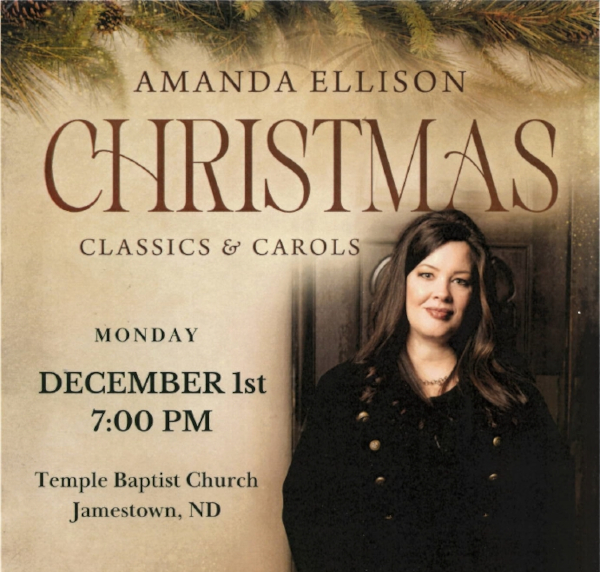 Jamestown – Amanda Ellison will bring the sounds of the season to Jamestown with her “Christmas Classics & Carols” concert on Monday, December 1, at 7 pm at Temple Baptist Church.