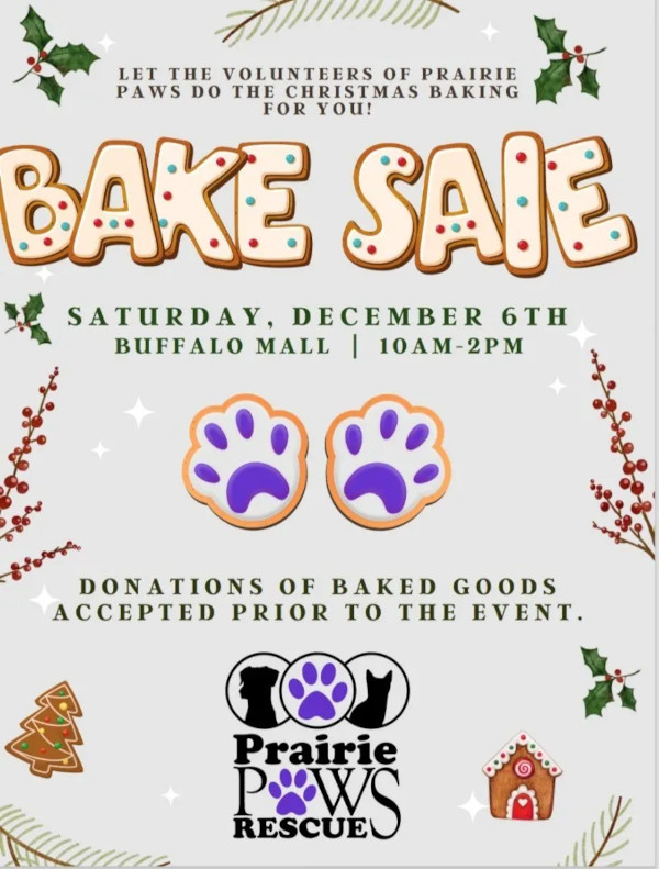 Jamestown ND – Prairie Paws Rescue will host its annual Holiday Bake Sale on Saturday, December 6 from 10 a.m. to 2 p.m. at the Buffalo Mall in Jamestown. Shoppers can browse a selection of homemade treats, with all proceeds helping support local pets in need.