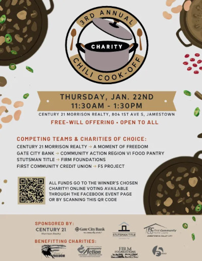 Community members are invited to enjoy a fun and flavorful chili cook-off on January 22 from 11:30 am to 1:30 pm at the Century 21 Morrison Realty office, located at 804 1st Avenue South in Jamestown. The event is open to all and supported by a free-will offering.