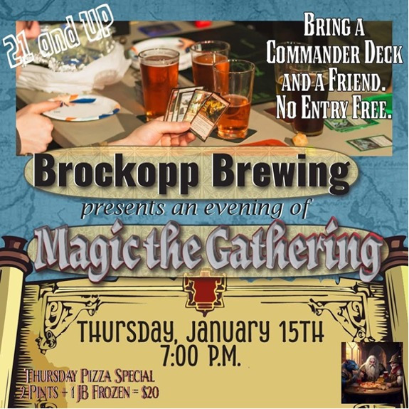 Brockopp Brewing will host an evening of Magic the Gathering on Thursday, January 15, beginning at 7:00 pm. The event is open to players ages 21 and older and welcomes both experienced players and newcomers to the game.