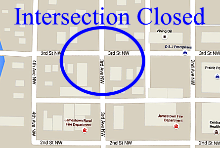 Jamestown (CSi) Jamestown Public Works advises motorists, that beginning Monday morning, July 11, 2016 roadways in and near the intersection of 3rd St NW & 3rd Ave NW, between 2nd Ave & 4th Ave NW will be closed to through traffic. Traffic/Detour signage will be posted as necessary.