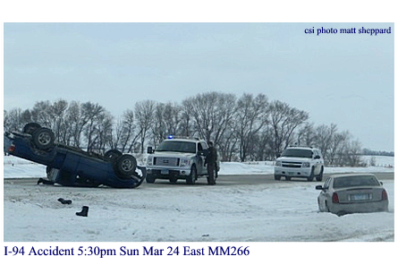 The Stutsman County Sheriff Department was at an accident in the eastbound lane of I94 after 5pm Sunday March 24, just east of mile marker 266, six miles east of Jamestown.