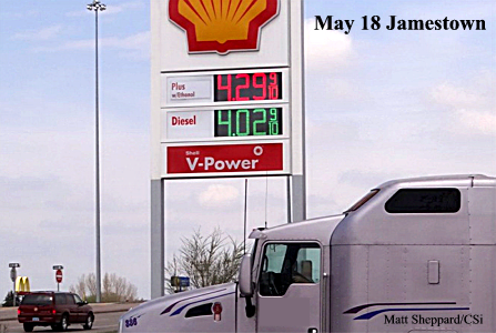 Update CSiNewsNow.com: Gas prices observed in Jamestown, ND Saturday May 18, 2013 at I94 & 281 S were $4.29. BISMARCK, N.D. (AP May 17, 2013) – Gasoline prices are on the rise and headed to a record in North Dakota.