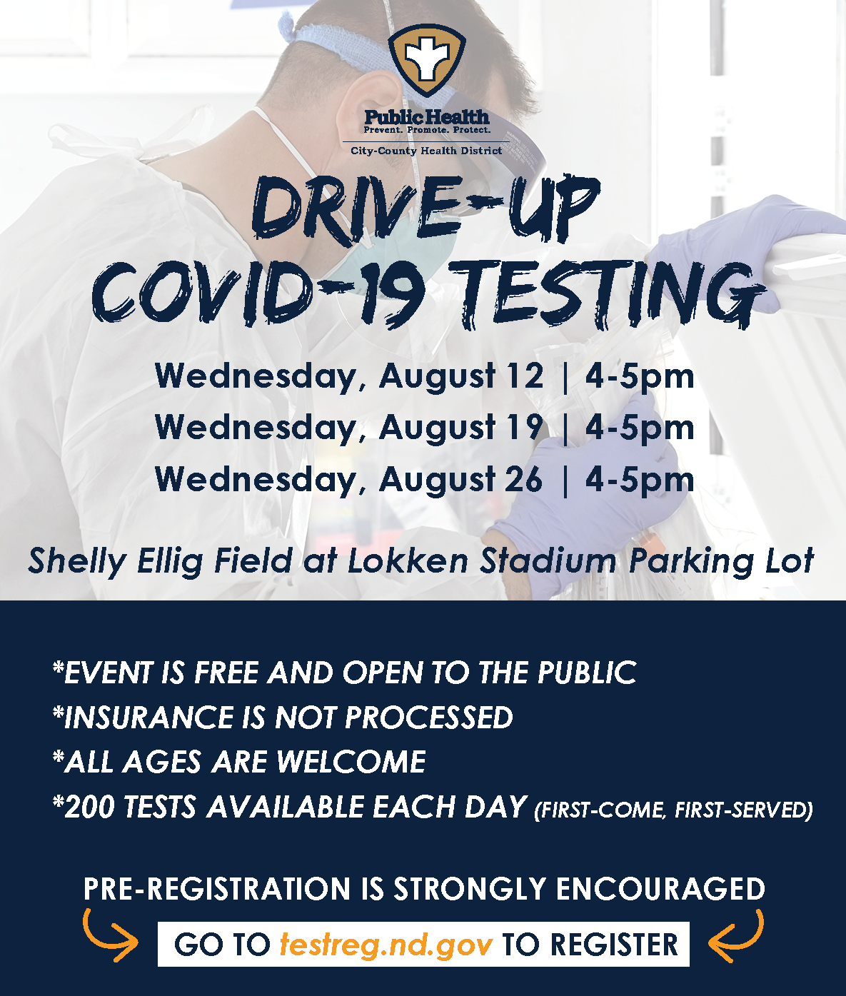 Drive-up COVID-19 for public at Shelly Ellig Field, Lokken Stadium parking lot from 4 – 5pm. 200 tests available. Event is first-come, first-served. No insurance is processed and there is no cost for the test. Please attempt to pre-register at testreg.nd.gov before the event.
