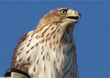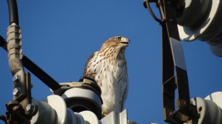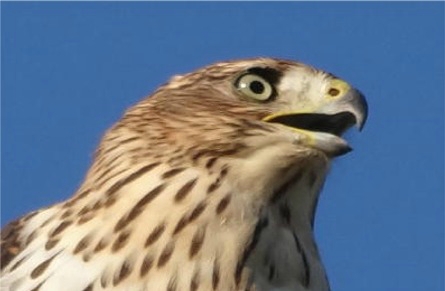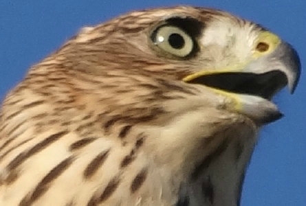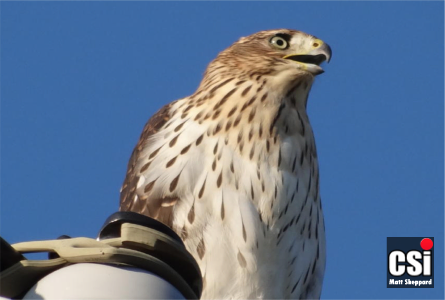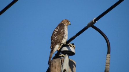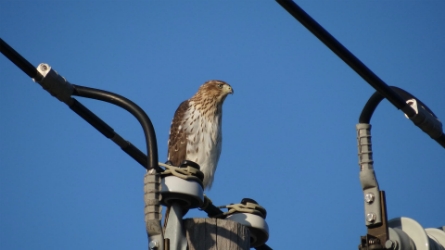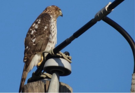 An immature Coopers Hawk was doing some hunting in our front yard. Several crows took exception and as a group began to challenge the young hawk, who retreated to the top of the utility pole, posing for some pictures, and then with crows in pursuit, headed west to the river.