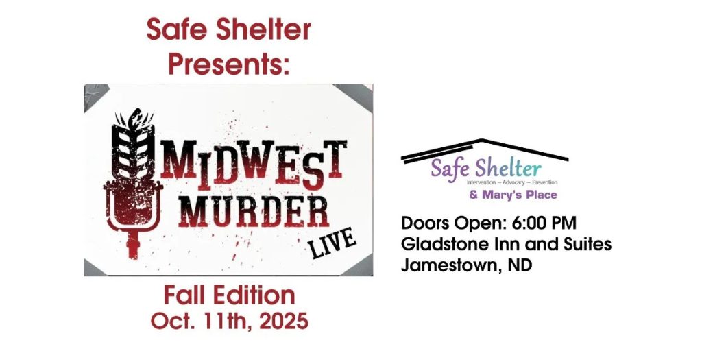 Jamestown (Safe Shelter) – True crime fans in Jamestown are in for a thrilling evening as Safe Shelter hosts the Fall Edition of Midwest Murder Live on Saturday, October 11, 2025, at the Gladstone Inn and Suites. Doors open at 6:00 p.m., with the show running from 7:00 to 10:00 p.m. CDT.