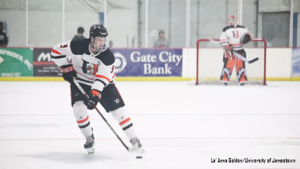 Jamestown – The University of Jamestown ACHA Division 1 men’s hockey team jumped out to an early lead and never looked back, defeating Midland University 4-1 in a physical matchup Saturday night at John L. Wilson Arena. The Jimmies scored three first-period goals and capitalized on two of their six power-play opportunities to secure the win in front of an enthusiastic home crowd.