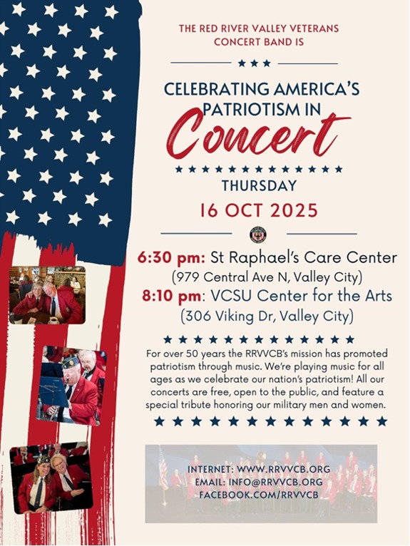 Valley City – The Red River Valley Veterans Concert Band will present “Celebrating America’s Patriotism in Concert” on Thursday, October 16, 2025, with two performances in Valley City.