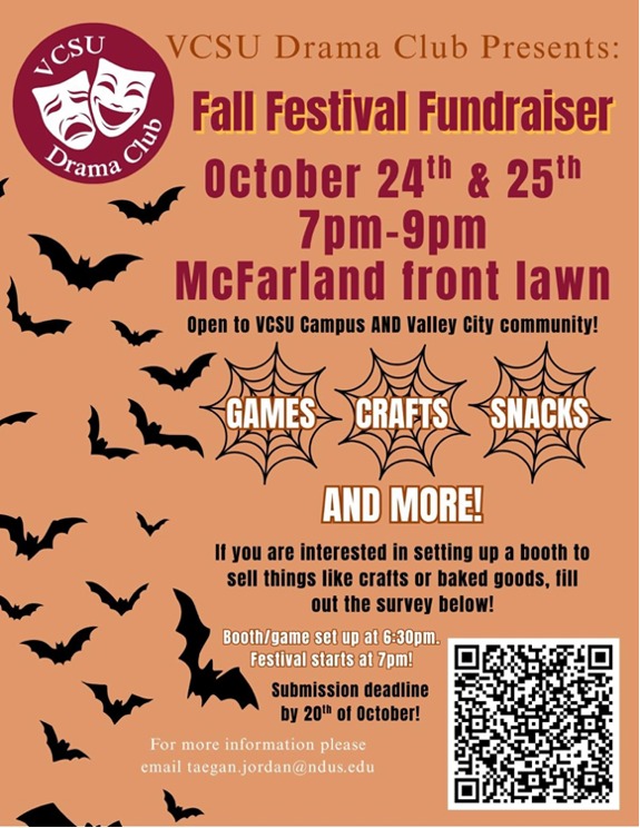 Valley City (VCSU) – The Valley City State University Drama Club invites the community to its Fall Festival Fundraiser on Thursday, October 24, and Friday, October 25, from 7 to 9 p.m. on the McFarland front lawn.