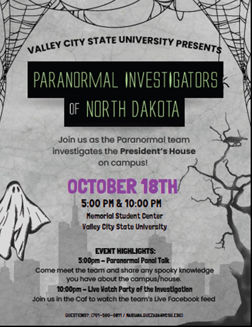 Valley City (VCSU) – Valley City State University will host the Paranormal Investigators of North Dakota, October 18, for a spooky evening exploring the mysteries of the campus. The investigation will focus on the historic President’s House, long rumored to have its share of unexplained happenings.