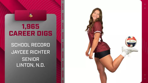 Valley City (VCSU) – Valley City State University Volleyball takes down Rocky Mountain College in straight sets as Viking senior JayCee Richter sets the school record in all-time career digs. After a 21-dig performance tonight, Richter improves her career total to 1,965 with 504 to this point this season. She passes Shelley Cockerill, who previously held the record with 1,958 career digs.