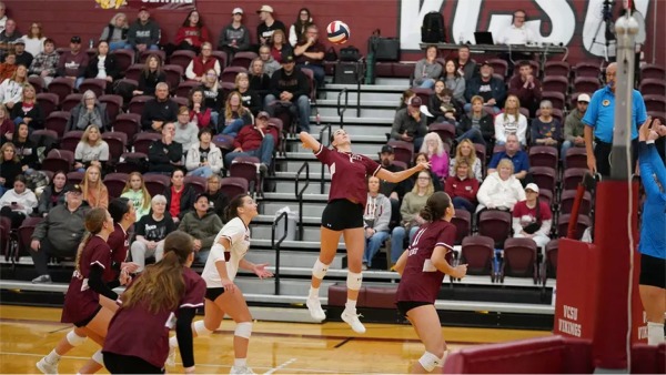 Valley City ND (VCSU) – The Valley City State University volleyball team took down (RV) Dakota State University in the final Frontier Conference home game of the season. The Vikings closed out the match in a nail-biting five sets. Set scores were 20-25, 25-23, 25-18,13-25, and 15-13.
