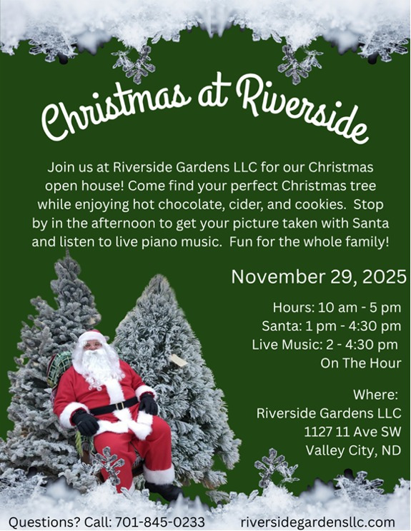 Valley City ND – Riverside Gardens invites the community to celebrate the season with its annual Christmas Open House on Saturday November 29 offering a festive and family friendly experience just in time for the holidays.