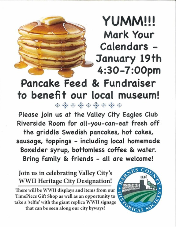 The Barnes County Historical Society will host a Pancake Feed and Fundraiser on Sunday, January 19, from 4:30 to 7:00 p.m. at the Valley City Eagles Club Riverside Room.