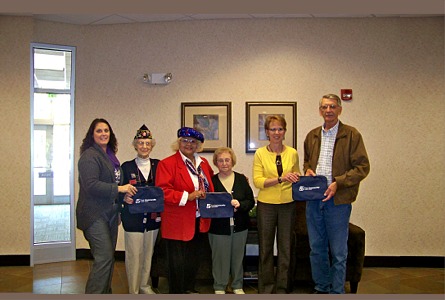 {Pictured above, from left to right: (Mona Elsner (volunteer/FCCU FSR), Dodee Graff (co-chair), Nellie Degen (co-chair), Marva L Miska (American Legion Auxiliary), Lori Dally (FCCU Head Teller/Supervisor), Leroy Wegenast (President of the board of the All Vets Club.)}