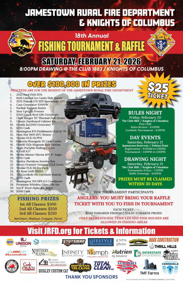 Bundle up and head to Jamestown Reservoir for a winter tradition that keeps getting bigger. The Jamestown Rural Fire Department and the Knights of Columbus will host their 17th Annual Ice Fishing Tournament and Raffle on Saturday, February 21, 2026. Even when the wind bites, the fish houses show up bright and plenty, and the lake fills up fast. Tickets are $25 each and support the Jamestown Rural Fire Department. This event helps fund gear and equipment that firefighters rely on when it matters most. In past years, tickets have sold out early, so do not wait if you want in. Tournament tickets are on sale now at select locations. Check the ticket post for the current list of purchase spots and any updates as they are added.