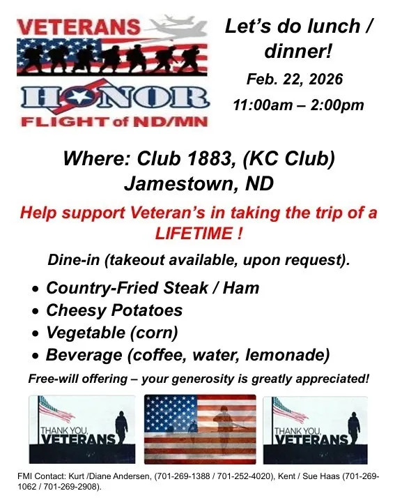 Community members are invited to come together in support of local veterans at a special fundraiser meal benefiting the Veterans Honor Flight of North Dakota and Minnesota. The event will take place Sunday, Feb 22, from 11 am to 2 pm at Club 1883 (KC Club) in Jamestown.