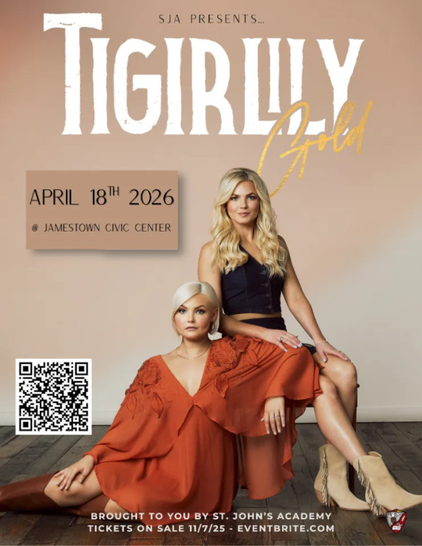 Country music fans in Jamestown are in for an exciting night as the rising sister duo Tigirlily Gold is set to perform in town, with proceeds benefiting St. John’s Academy. Saturday, April 18th 7-11 pm Jamestown Civic Center. TICKETS ON SALE NOW thru April 18th. All tickets are General Admission, first come first serve seating. General Admission = $40 + fees. Tickets at the Door = $45 + fees