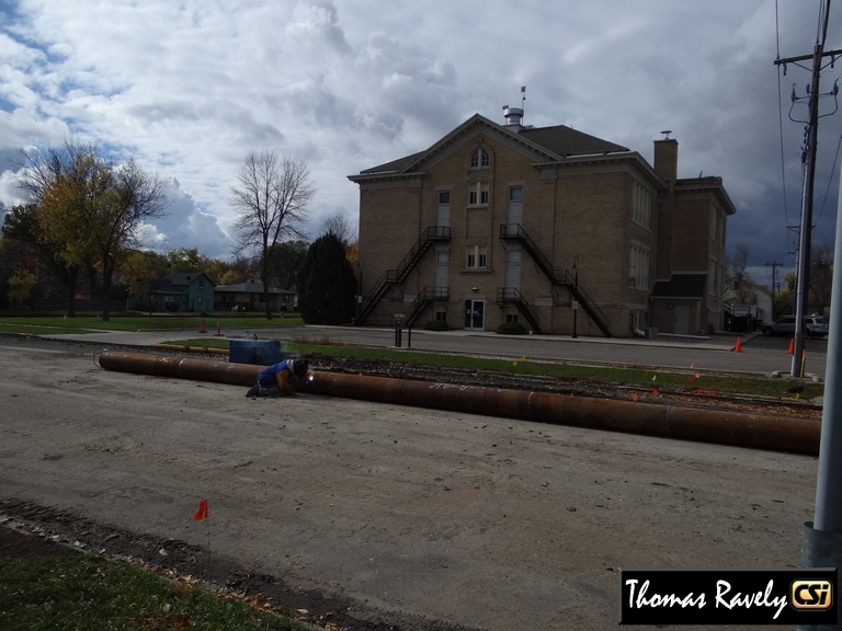 On Friday Oct 18, sections of steel pipe were being welded on 3rd Av SW in preparation to be installed under the Burlington Northern tracks. Friday pipe photos by Thomas Ravely