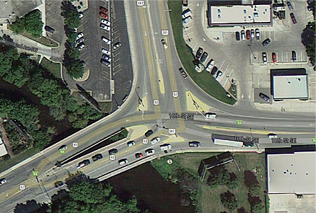 Shannon said a possibility is moving the streets to form more of a T-shaped intersection, providing a new traffic signal system to control the right-turn lanes and left turns and straight movements at the intersection, thus allowing the addition of crosswalks and pedestrian crossing lights