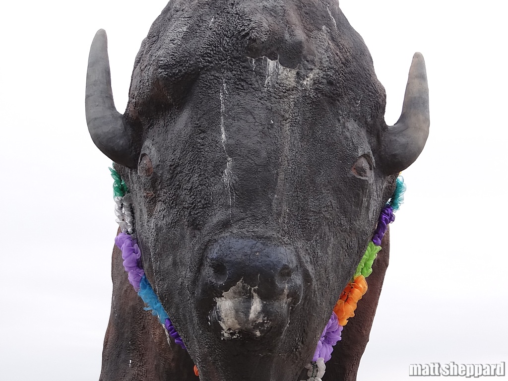 To call attention to the many types of cancers being battled, volunteers placed 50 wreaths around the neck of the concrete buffalo. Barb Togstad made all the wreaths.
