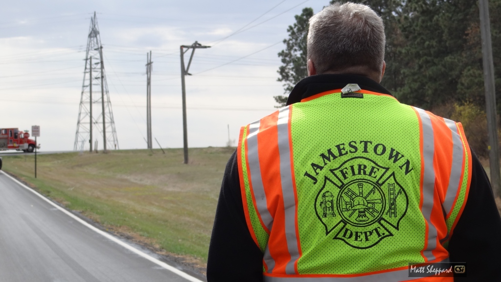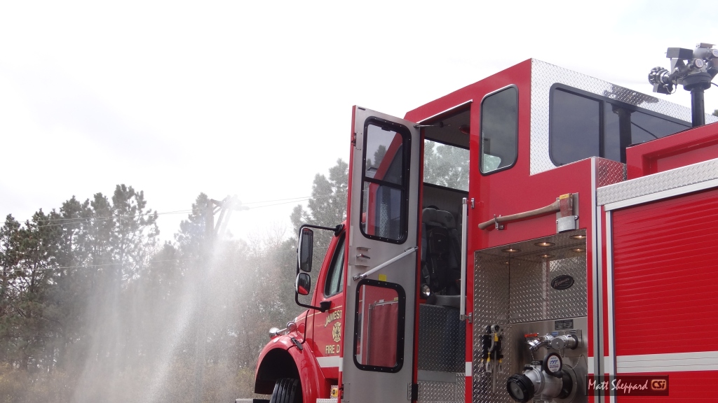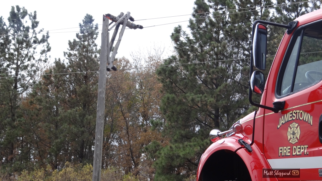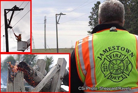 Jamestown, ND (KCSi-T.V. News) — The Jamestown City Fire Department was called to the road to the State Hospital about 12:15 p.m., on Wednesday, (Oct 3, 2012) where an Otter Tail Power Company electrical pole was burning.