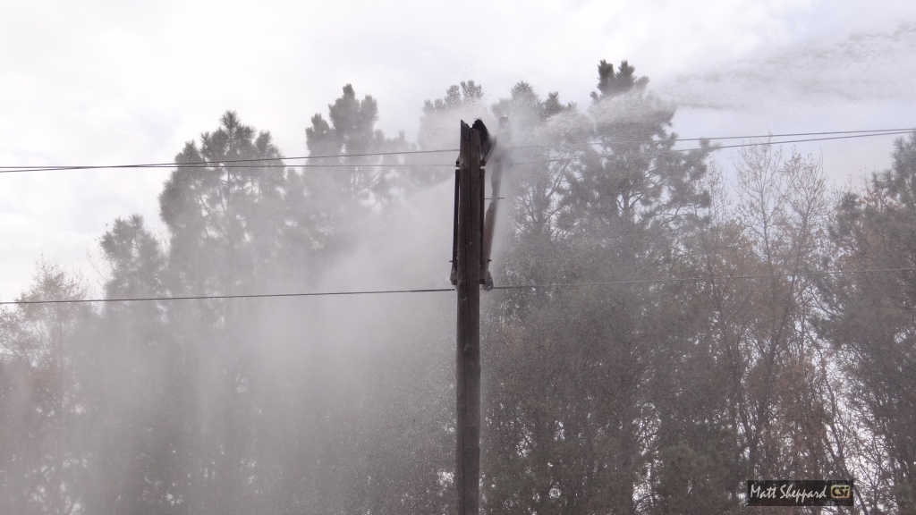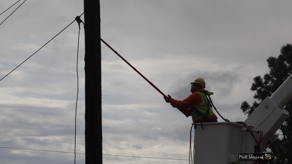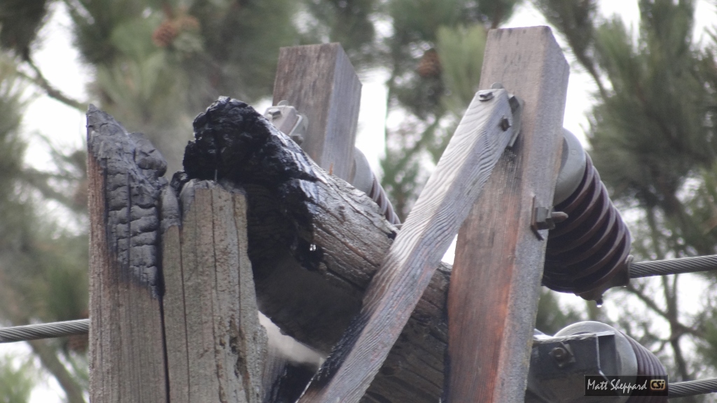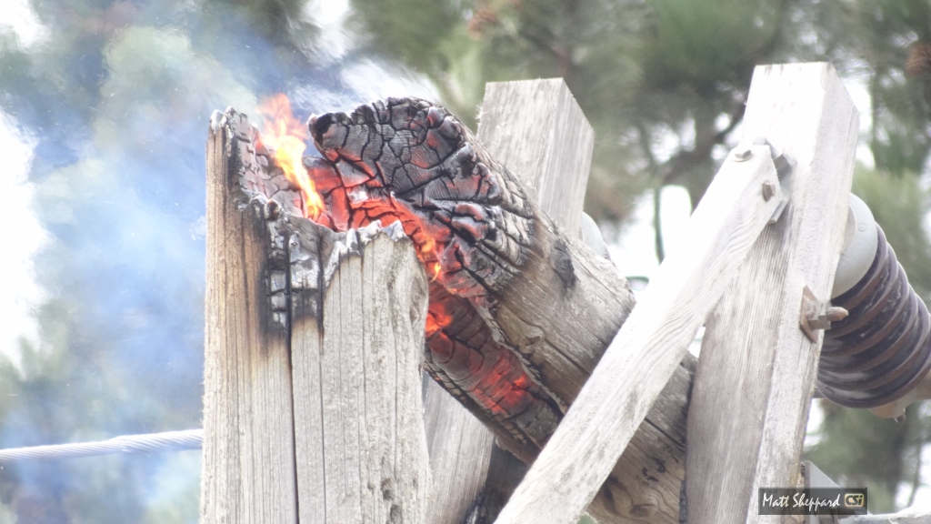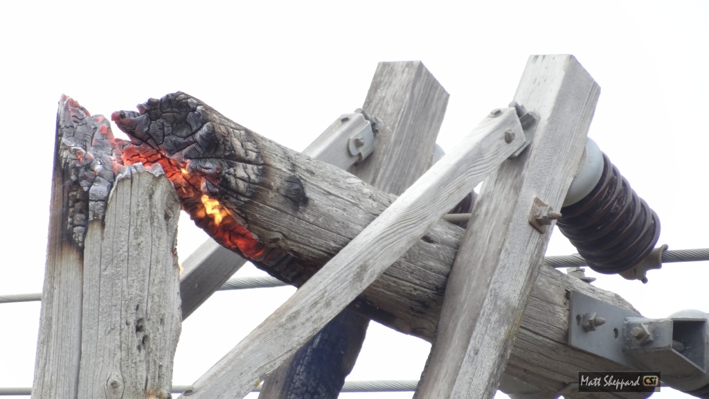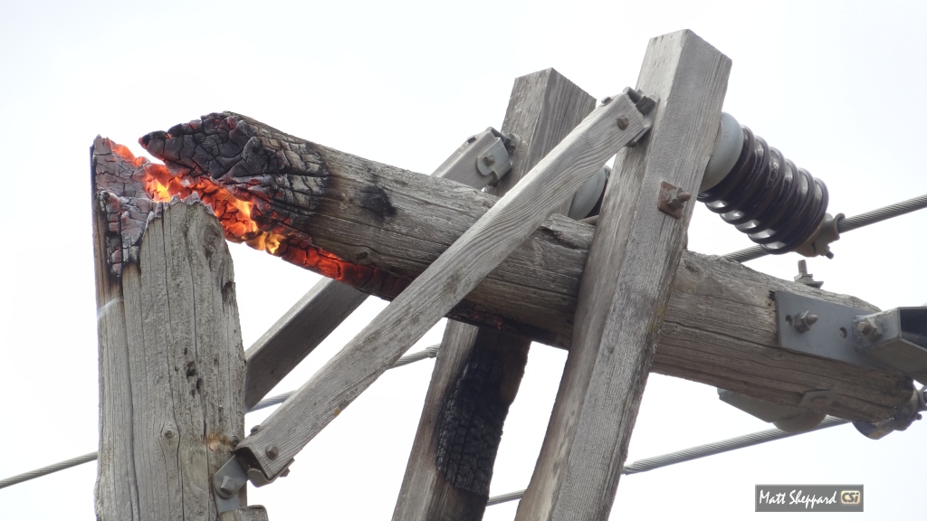 Assistant City Fire Chief, Jerry Kainz says, the top third of the poll was on fire when the units arrived, and that section of the poll broke off and fell into a power conductor, and began sparking and arcing. He adds that the line was carrying 40,000 volts of electricity.