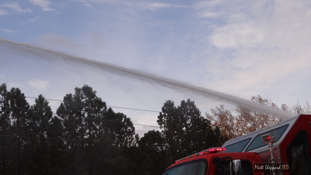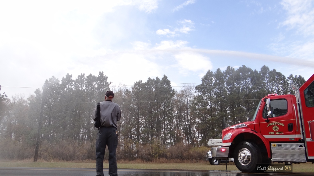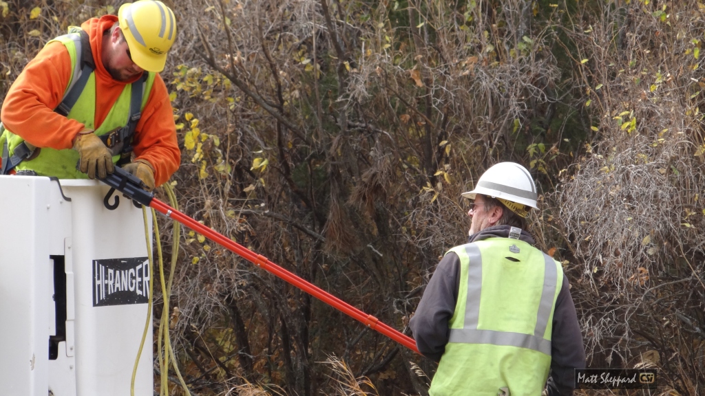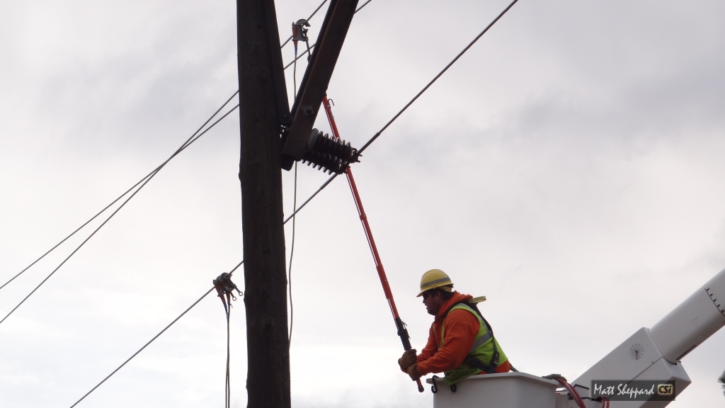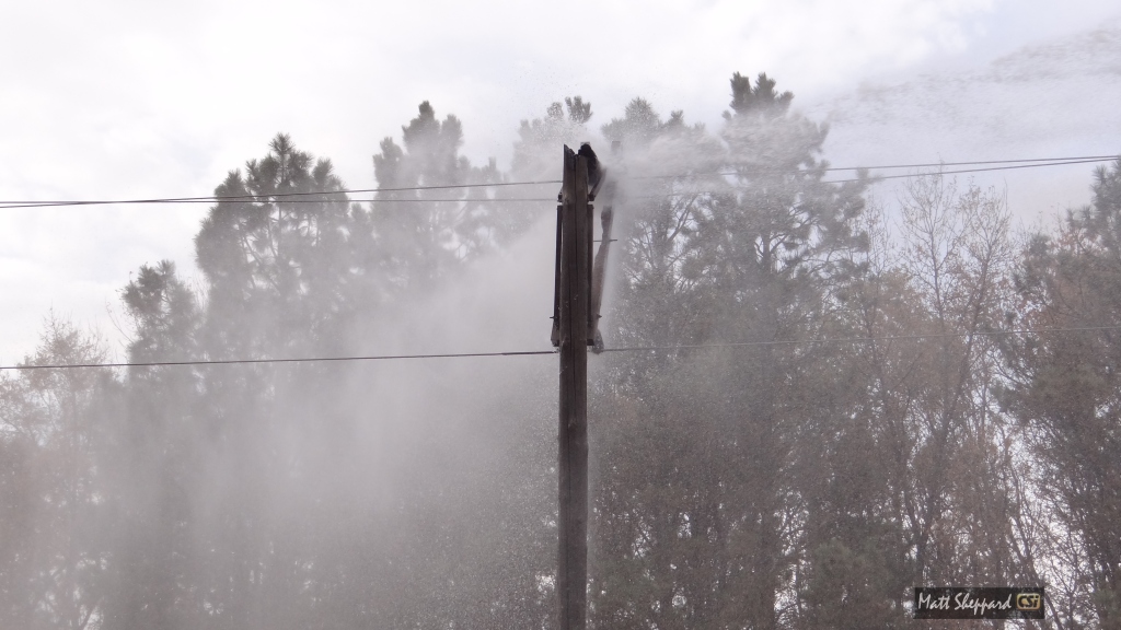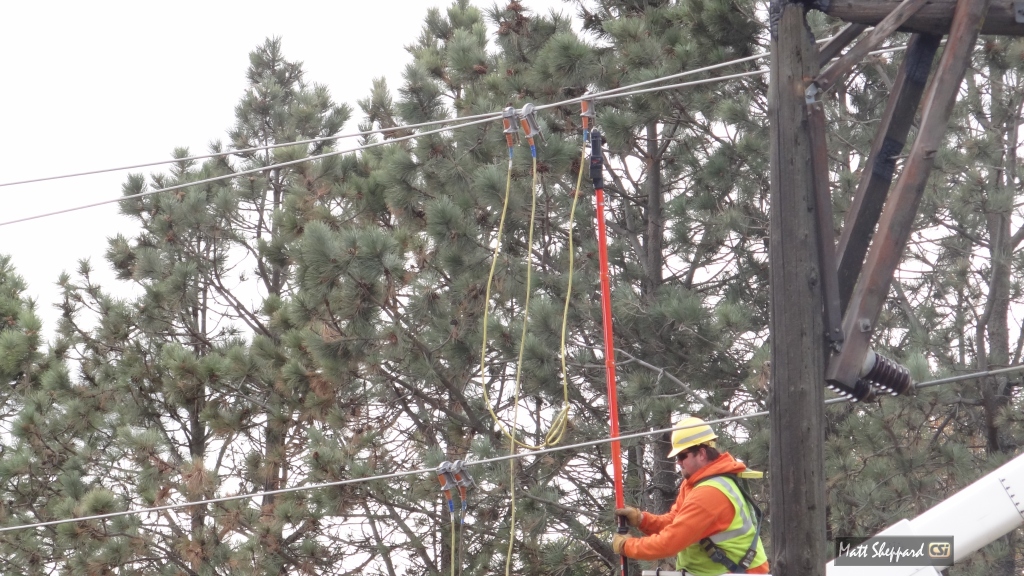 Assistant City Fire Chief, Jerry Kainz says, the top third of the poll was on fire when the units arrived, and that section of the poll broke off and fell into a power conductor, and began sparking and arcing. He adds that the line was carrying 40,000 volts of electricity.