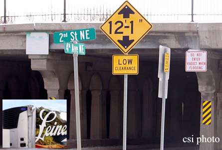 The truck, traveling south on 4th Av NE, was being operated by a fill-in driver making deliveries and struck the north side of the low clearance viaduct.