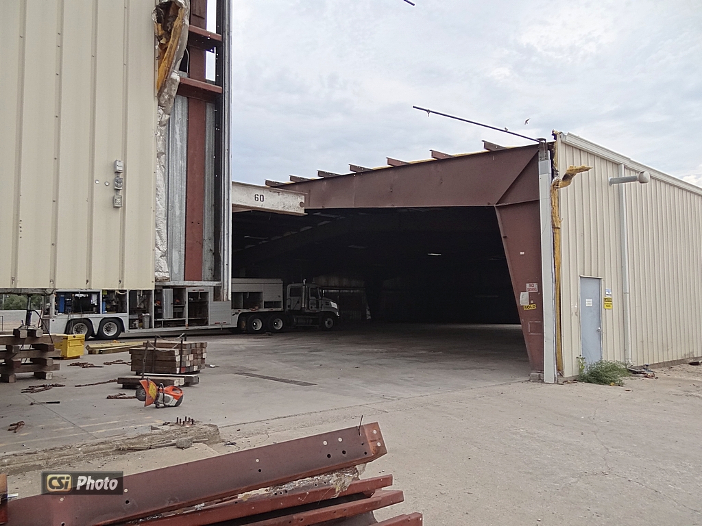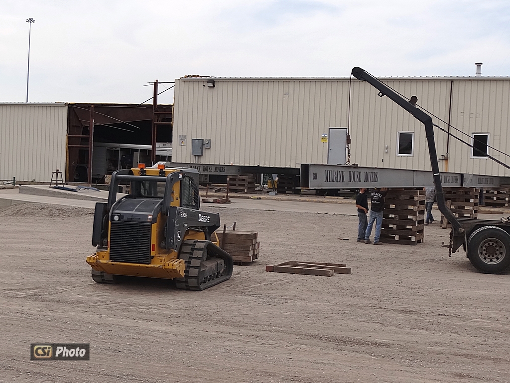 Hugh Hillstrom, the structure is being moved 200 feet to the east…used for storage, it will become a cold facility storage unit that will house tires, concaves, customer equipment and other goods. Trevor Williamson, lot manager of Valley Plains Equipment, points out that the move will increase the height of the original building 4 feet to create a higher sidewall for machines parked in the shop.